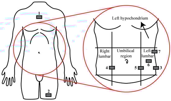 As can be seen in Figure 2, participants wore seven inertial measurement units (IMUs) (NGIMU, x-io Technologies, Bristol, UK), which measured acceleration using a sampling frequency of 20 Hz. One was placed on the upper left leg, one on the sternum, one on the left side of the pelvis, three on the abdomen (left and right of the umbilical region, near the edges of the lumbar areas, and one in the middle of the left lumbar region), and one on the left side on the body (the upper left lumbar region, near the left hypochondrium). The locations of the five IMUs in the abdomen region correspond to realistic varying positions of the sensors as placed when using the AP™ in daily life. The two other IMUs were expected to provide additional information regarding postures as the sternum and upper leg vary more in orientation when adopting several postures [].