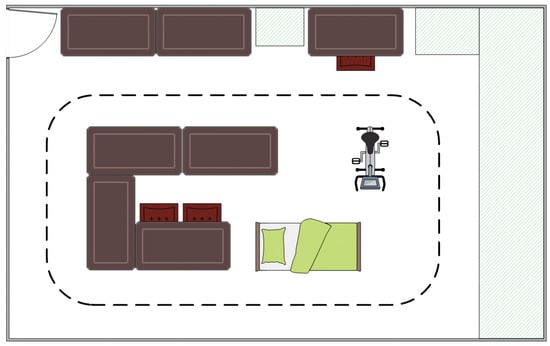 Figure 3 illustrates the floorplan of the experiment. Six postures and movements were taken into consideration to be identified, as many (instrumental) activities of daily living consist of (combinations of) these postures and movements: lying, sitting, standing, walking, running, and cycling [,]. The experiment consisted of three phases: performing isolated postures and movements, performing sequences of these postures and movements, and performing functional tasks. The load of the home trainer was set in such a way as to be comfortable for each individual participant.