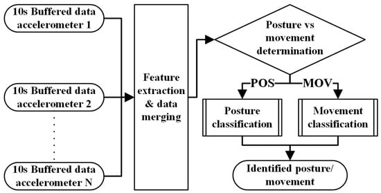 As the AP™ is a fully transportable system, it operates on batteries that last approximately 3 days and its transmitters last 3 weeks. Therefore, the software is carefully crafted to prevent it from consuming too much power. This means the algorithm should be as simple and computationally sparing as possible. Figure 4 is a schematic representation of the proposed identification algorithm, which can be implemented for any number and combination of sensors. First, data of each sensor are buffered for 10 s, to be used for feature extraction and data merging. Next, the merged features of all sensors are used for a distinction to determine whether an individual is assuming a posture or is moving within this 10-s window. Finally, these and other features are used to classify a specific posture or movement.