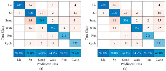 Confusion matrices after testing user-specific models using several sensor combinations of all seven subjects. (a) only sensor 3 (accuracy 86.5%); (b) sensors 3, 4, and 5 (accuracy 87.3%). The bottom row represents the positive predictive value for each posture or movement.
