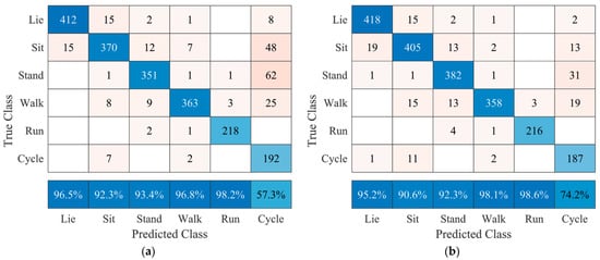 Confusion matrices after testing user-specific models using several sensor combinations of all seven subjects. (a) sensors 1 and 2 (accuracy 89.2%); (b) sensors 1, 2, and 3 (accuracy 90.0%). The bottom row represents the positive predictive values for each posture or movement.
