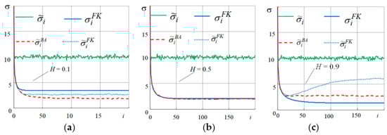 As Figure 4a–c show is the expected r.m.s of estimation errors corresponding to the error variance of optimal estimation, which is the only element of the analysis matrix of KF covariance errors. is the selective r.m.s of filtering errors when using KF; is the expected r.m.s. of filtering errors when using non-recurrent BA; is the selective r.m.s. of filtering errors for BA, and is the selective r.m.s. of measurement errors.