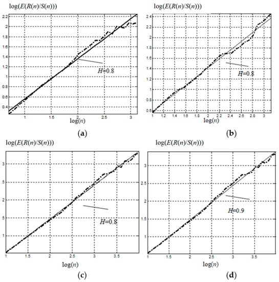 To identify the features of the fractional structure of the process, fractality indicators such as the Hurst parameter are used. Several methods are used to estimate the Hurst parameter, including: rescaled range analysis (the R/S method), variance change graph analysis, and wavelet analysis [13,14]. According to the R/S method, the Hurst parameter of a time series is calculated by the following formula:
