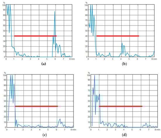 Echo signals of ultrasonic flaw detector during non-destructive testing of rivet joints: (a) is a normal rivet; (b) defect in the middle of the rivet at the 80% undercut; (c) defect in the middle of the rivet at the 50% undercut; (d) defect at the rivet cap base at the 50% undercut.