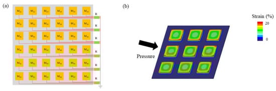 However, the pressure-sensing arrays made of rigid metal materials show poor biocompatibility and ductility. As a consequence, it may cause allergic reactions or other adverse physiological impacts while in contact with human skin. The poor ductility greatly limits the application range of the pressure-sensing array. It cannot be applied in high-curvature or uneven surfaces. Sekitani et al. used PEN (polyethylene naphthalate) as a substrate and organic material as a conductive layer to fabricate a flexible pressure-sensing array. The fabricated array can detect the spatial distribution of applied mechanical pressure and convert it into two-dimensional images for storage []. So et al. embedded a PDMS layer in the vertical arrangement of carbon nanotubes to make a flexible pressure sensor, which realized the function of tactile sensing [].