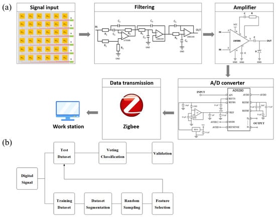 The procedure of signal processing is presented in Figure 3a. The pressure signal output by the FHSA first passes through a filter circuit to filter out the high-frequency noise interference contained in the signal. Considering the weak strength of the voltage signal, we designed an amplifier to amplify it, which is conducive to subsequent processing and analysis. Before inputting to the computer via Zigbee, the signal is converted from an analog signal to digital form through an analog-to-digital conversion module.
