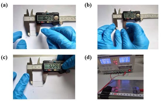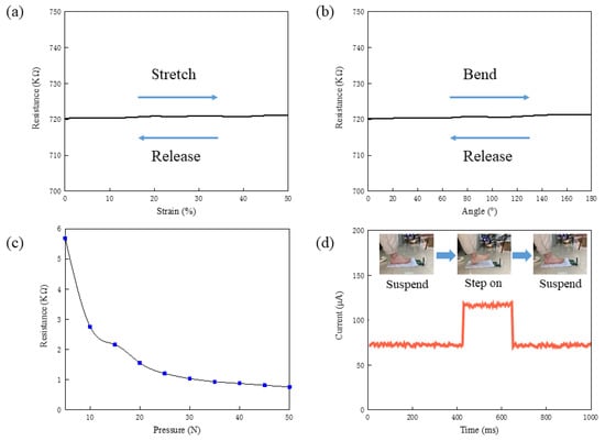 To illustrate the structural flexibility of the fabricated FHSA, we studied its mechanical properties by conducting the tensile and bending experiments (Figure 4a–c). The tensile test is realized on a programmable stretcher (IPBF-5, CARE Measurement & Control Co., Ltd., Tianjin, China). The FHSA is placed on the middle platform of the stretcher and clamped at both ends, and the stretching of it is realized by the movement of the clamps which are controlled by stepping motors. A digital multi-meter (MT-1820-C, Prokit’s Industries Co., Ltd., Taiwan, China) is connected to the FHSA to read the value of resistance (Figure 4d). The bending test was carried out on a bending test machine (YHS-216W-10kN-360, Yihua Instrument Technology Co., Ltd., Shanghai, China). One end of the FHSA is fixed, and the other end is connected with a clamp. The clamp moves along the track to make the FHSA bend between 0 and 180. Similarly, under different bending angles, the resistance of the FHSA is recorded by the digital multi-meter.