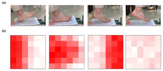 The protocol for obtaining the pressure input is to have volunteers step on the FHSA placed on the ground and walk back and forth five times []. A total of six hundred sets of pressure data (left-foot and right-foot) of diverse gaits were gathered. We selected four different gait patterns (Figure 6a), and their pressure distributions are shown in Figure 6b.