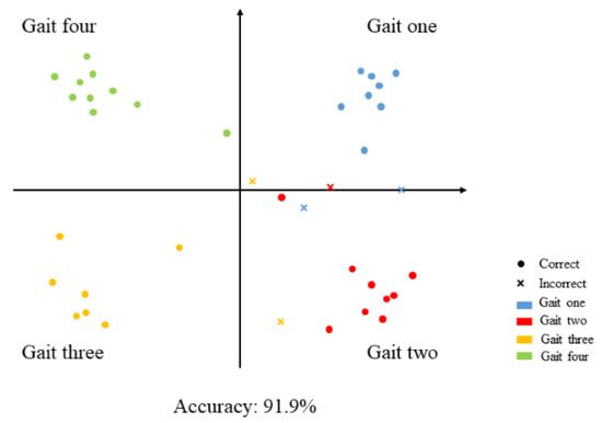 We randomly selected 500 sets of data as the training set to train our proposed WT-RF algorithm model, and the remaining 100 sets of data were used for testing to obtain the gait recognition accuracy of the trained model. The classification results of the WT-RF algorithm are presented in Figure 7.