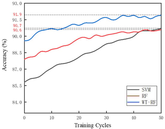 Comparison of accuracy of SVM (90.7%), RF (90.6%), and WT-RF algorithms (91.9%) under 50 training cycles.