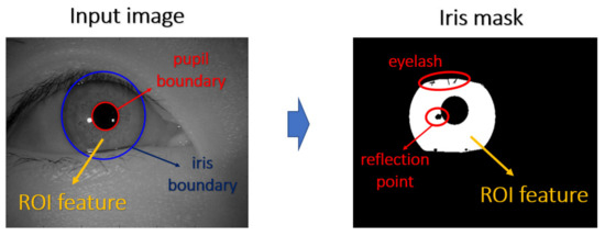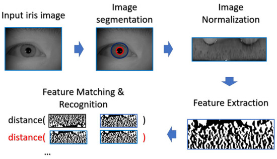 According to the framework proposed by Daugman [30,31,32,33,34], the process of iris recognition can be divided into four stages: image acquisition, image preprocessing, feature extraction, and feature matching.