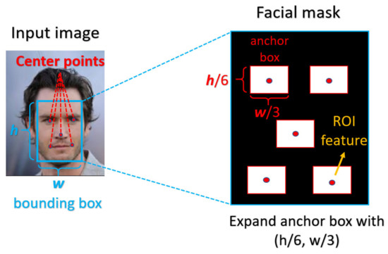 In order to precisely indicate the ROI in the input image, we designed each mask according to the corresponding domain knowledge to extract the discriminating features. For the iris mask, most of the features are located at the region between the iris boundary and the pupil boundary, and the noise of the image, such as eyelash and reflection points, will be further excluded from ROI. For the facial mask, we use the facial landmarks as the center points of the ROI anchor box, and the anchor boxes have a suitable shape in accordance with the aspect ratio of the corresponding face bounding box. From a practical view, the simple five-point landmarks, which are the coordinates of eyes, nose, and mouth corners, will be used as the center points during our experiment. A pictorial example of the corresponding mask is depicted in Figure 3 and Figure 4, respectively. In our proposed method, the mask will be a given input to the attention mechanism. In the training phase, we took the manually labeled mask as the input to guarantee that the ROI is perfectly accurate, while the labeled masks will also be used during the test phase.