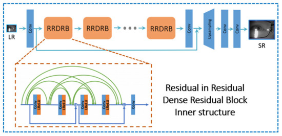 Furthermore, Nathanael Carraz Rakotonirina et al. [26] proposed nESRGAN+, which was the enhancement of ESRGAN, by placing the RRDB into the RRDRB via further adding the concatenation path in the inner dense block, which will increase the network capacity. The trick of giving finer details in the high-level aspects meant adding the Gaussian noises on the main path of the RRDRB structure.