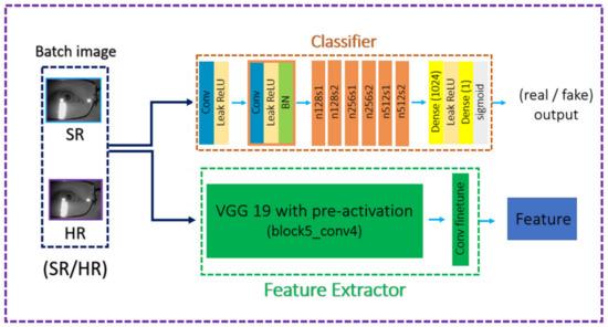Similarly, is composed of the VGG-based module and the deep convolution module. The former classifies the image on the perceptual level, and the latter works toward minimizing PSNR. For more details for the network structure, please refer to Figure 6 and Figure 7.