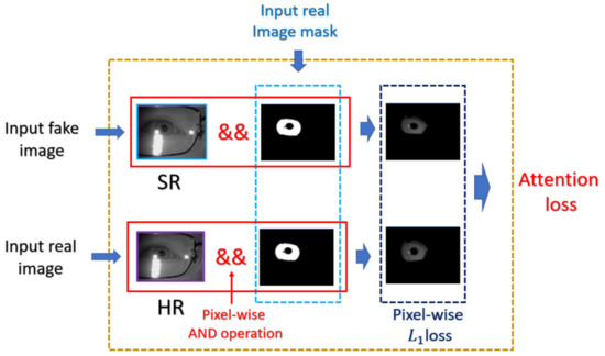 The proposed method attempts to enhance the image quality within ROI by the attention mechanism in the spatial domain. In this section, we first describe the mask labeling for biometrics to mark the ROI, and then discuss the network structure as well as the corresponding loss function. Lastly, we describe the proposed attention module as well as the novel loss function of the generator. The flowchart of the proposed method is shown in Figure 2.
