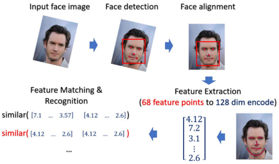 For face recognition, the face image is captured by the optical sensor, which can be either RGB sensor or NIR sensor. The preprocessing including face detection and face alignment is executed so that the location of face can be detected and the input face can be properly aligned. After that, depending on which model or classifier is chosen for the recognition, there exist different ways for feature extraction for face biometrics. In our experiment, we adopt a deep-learning based model. We applied Dlib library [35] on the aligned face to extract the feature and encode it into the 128 dimensional vector and the encoded value will be normalized into the range [0, 1]. The feature extractor in Dlib applied a very deep residual network as the backbone to extract the face feature as well as to encode the facial identities. In the matching phase, the probe face code is matched against all the face templates in the enrolled database by computing the distance between the two face codes. In this paper, the threshold value of the distance is selected by considering the best EER. The overall process is depicted in Figure 11.