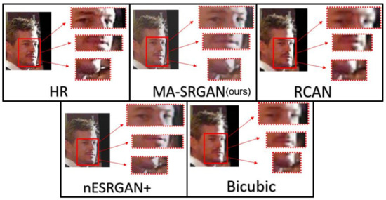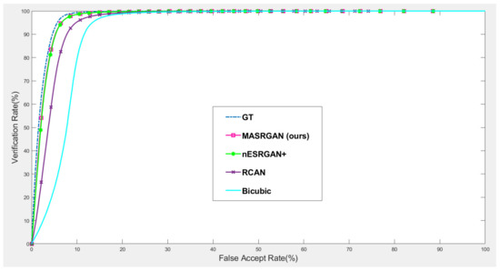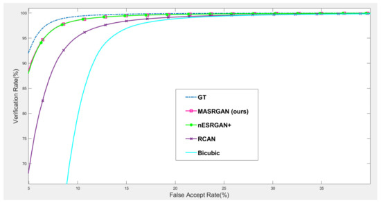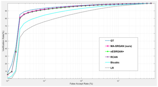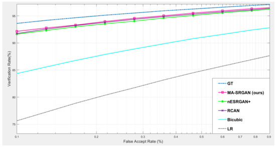 Our proposed MA-SRGAN can be applied to face recognition and it also works better than most of the SR methods in terms of EER, as Figure 15 describes. In the further comparison, the proposed method achieves higher VR than the nESRGAN+ with the lower FAR. Furthermore, MA-SRGAN achieved an outstanding result in 6.23% of EER, which is lower than the latest SOTA and partially reflects the 89.75% VR, shown in Figure 16 as well as Table 4. This also highlights the benefits of using the attention module, which can also present more informative details about the distinguishable part of face recognition.