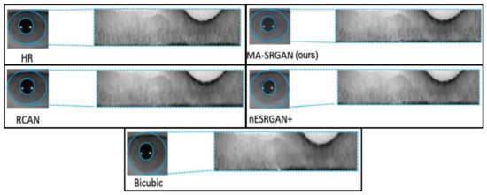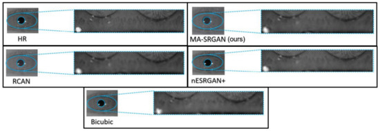 For iris recognition experiments, we observe that the proposed MA-SRGAN performs better than the most of super resolution methods in terms of EER as illustrated in Figure 13. In the further comparison between MA-SRGAN and nESRGAN+, which is the latest state-of-the-art (SOTA) of SRGAN, our proposed method has better performance than nESRGAN+ in the situation of low FAR, and achieves the lower EER with 2.3%, as described in the Figure 14 and Table 3, respectively. The ground truth (HR) images achieve an EER of 2.072%.
