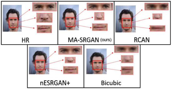 Since the proposed MA-SRGAN is based on the backbone of nESRGAN+, the most of the parameters are still unchanged to achieve the optimized setting. At first, we also make use of the PSNR-oriented pre-trained model to initialize the generator. The values of λ and η are set to be the value described in the original nESRGAN+ paper [26] (λ = 5 × 10−3, η = 1 × 10−2), and the value of is set the same as η. The learning rate is set to 1 × 10−4, and the model is optimized using Adam with β1 = 0.5 and β2 = 0.999 with training 10,000 epochs. The trained model is the one with the three-blocks generator. The implementation is done with Keras based on the TensorFlow backend, and trained with four NVIDIA GeForce GTX-1080 GPUs.