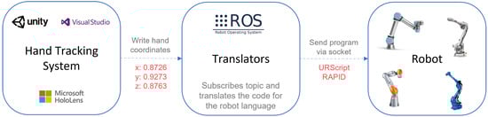 The system developed to program robots using AR was divided into two different subsystems: the one where the path data were acquired and the one responsible for translating the hand coordinates to the robot’s language and sending them to the robot. The main objective of the first one was to provide a simple and smooth interface, which had to be intuitive and cannot contain any distractions, otherwise, the operator could be confused with the excessive information. The second one focused on the development of the translators that transformed the received hand coordinates into the different robot programming languages. As the robots used for the implementation were the Universal Robots UR5 and the ABB IRB 2600, the translators developed could generate code for the languages URScript and RAPID. It was opted to develop these translators in Robot Operating System (ROS). Figure 1 represents the system overview.