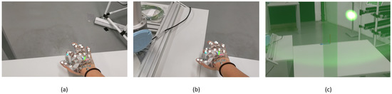 Coordinate system definition: (a) finger marking the origin’s place. (b) Finger marking the point that would define the referential frame orientation. (c) Setup finished.
