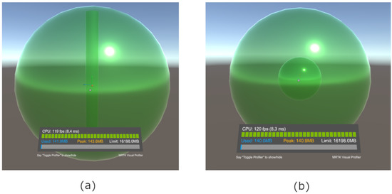 The method used to verify if the user was recording the movement within the robot’s workspace was similar to the one used for UR5, but, as in this case the workspace is constituted by two spheres, the equation used to calculate the maximum and minimum distance was Equation (1). It is worth urging the fact that this design was an approximation of the robot’s model, as the 3D object drawing was not the core of this work.