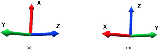 A ROS package was created to implement the two program translators, one for each robot programming language required (URScript and RAPID). There was one additional adjustment to be done to the coordinates, because in HoloLens 2 application the coordinate system was defined to have the X axis pointing upwards, whereas the robots’ coordinate system had the Z axis pointing upwards. Thereby, the coordinates were matched as shown in Equation (5), where a rotation matrix was applied between both referentials (Figure 5 represents that matching graphically).