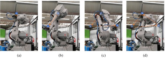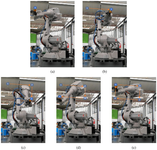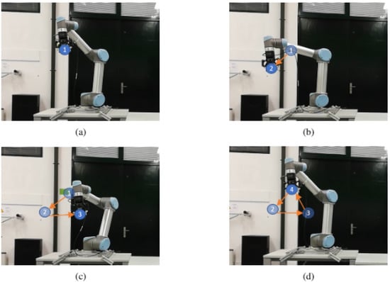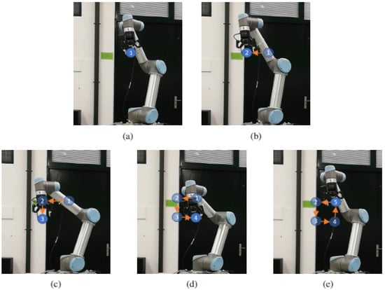 In the following link (https://youtu.be/joV-4uArWDw, accessed on 18 August 2021) a video is displayed illustrating the experiments performed. Although any path could be programmed, the first experiment on UR5 was drawing a triangle, for being easy to detect if it was being correctly performed (three vertices and three edges). Figure 6a,d show the different moments where the robot reached a vertex. The blue circles numbered and the orange arrows were added to mark the previous vertices reached by the robot, for a easier understanding of the movement through the images. Additionally, another experiment was performed: a square. Figure 7 shows the different moments where the robot reached each vertex (Figure 7a,e).