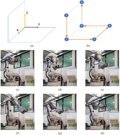 A third experiment was performed in a three-dimensional space. Figure 10a shows the different directions of the drawing following the three axis. In that sense, a three-dimensional figure was drawn like the Figure 10b. The robot started in point 1 and moveed through the Z axis to point 2; then, through the Y axis reached point 3; next, to go to point 4 moved along the X axis; afterwards, to go to point 5 advanced through the Y axis; finally, to go to point 6 proceeded through the Z axis. Figure 10c,h try to show that three-dimensional drawing.