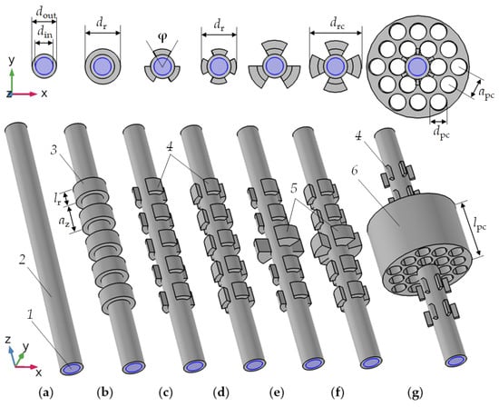 Model development of pipe-based resonators: a long liquid-filled pipe (a); a tubular phononic crystal with full (b) and sectioned rings periodically arranged along the pipe axis (3 (c) and 4 (d)); tubular phononic sectioned rings, where the central ring sectors have a larger diameter (e,f); a tubular phononic crystal acting as a defect in a two-dimensional phononic crystal (g). Resonator models consist of the following elements: 1—liquid; 2—pipe; 3—identical rings; 4—equidistant sectioned rings; 5—sectioned rings of a larger size in the centre of the pipe; 6—2D phononic crystal made of a perforated cylindrical block.