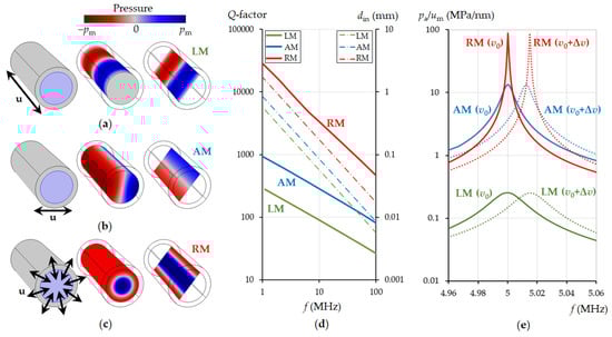 Resonant mode excitation in a cylindrical resonator and their Q-factors: pressure distribution in a liquid for the longitudinal (a), azimuthal (b) and radial (c) mode according to the action of mechanical displacement in the solid as shown by arrows. Dependence of the Q-factor of the eigenmodes on the resonance frequency (d left axis) and the corresponding values of the inner diameter of the cylindrical resonator (d right axis). Frequency dependence of the volume-averaged absolute pressure in the liquid in relation to the magnitude of the exciting mechanical displacement at 5 MHz resonance (e). The calculations were performed for water at a temperature of 20 °C, v0 = 1481 m/s (solid lines), Δv = 5 m/s (dotted lines).