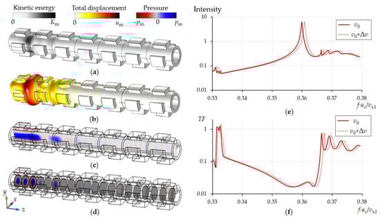 Propagation of acoustic waves along a pipe with a periodic structure of sectioned rings from left to right (a–d), the intensity of acoustic waves in the first unit cell (e) and the transmission spectra for two sound velocities of water (f). The inner diameter of pipe is din = 353 μm. Lattice period of a tubular phononic crystal is az = 2din. The calculations were performed for v0 = 1481 m/s, Δv = 5 m/s.