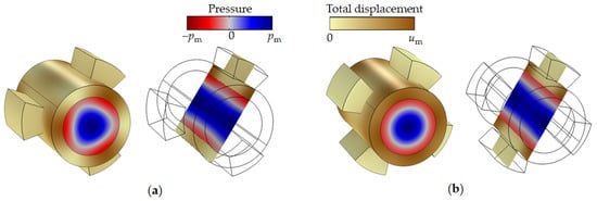 Unit cells of the tubular phononic crystal with a 3 (a) and 4 (b) ring segments: distribution of pressure and displacement fields. The radial mode was excited by applying a mechanical displacement to each sector along the normal of the cylinder surface.
