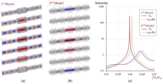Since the central unit cell faces a phononic crystal both left and right, the acoustic energy of resonance will be localized within it. Radiation of acoustic energy along the pipe axis can be excluded and the resonance provides a high Q-factor. For illustration, we compare the two models in Figure 5. Model 1 (Figure 5a) shows a section of the cylindrical tube with four equidistant piezoelectric elements along the circumference of the pipe placed in the central part excites the radial resonance mode of liquid pressure. Model 2 (Figure 5b) considers a tubular phononic crystal of 5 sectioned rings. Diameter and length of the tubes are the same in both models. At the edges of the tube, the boundary conditions for the radiation of acoustic wave energy are applied. The central segments in both models are excited by applying an external mechanical displacement normal to the surface of the tube. Full harmonic oscillations of the liquid pressure in the pipe were calculated. Figure 5a,b show a series of images representing one oscillation period, divided into 7 snapshots. The pressure in the central part of the pipe was calculated (Figure 5c) for two different sound velocities of the liquid. The other liquid parameters were the same (Table 1). In the first case, a traveling pressure wave is generated in the tube along the axis in directions from the centre to the edges (Figure 5a), which causes a low resonance Q-factor due to radiation losses along the axis of the tube (Figure 5c, blue curves). In the case of model 2, the phononic crystal elements applied to the outer part of the tube lead to the formation of a standing wave along the tube axis. The acoustic resonance energy is localized in the central part of the tube, which makes it possible to achieve an extremely high Q-factor (Figure 5c, red curves). The Q is limited only by internal viscous losses in the liquid. The radial mode also minimizes these losses due to the absence of shear displacement at the interface to the pipe. The Q therefore provides a well-defined access to important liquid properties, Equations (11) and (12) in addition to sound velocity.