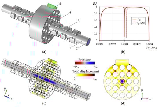 Design of the phononic crystal sensor, simulation results at resonance conditions in the pipe (a) with 1—liquid, 2—pipe, 3—sectioned rings, 4—2D phononic crystal, 5—piezoelectric transducer. Reflection spectra of sensor (b). Pressure and displacement field distributions close to liquid resonance conditions (c,d).