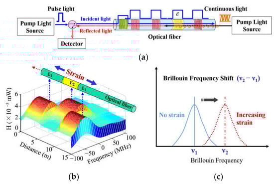 (a) Monitoring principle of the both-ends detection of BOTDA; (b) the Brillouin frequency shift distribution stimulated by strain change. (c) the relationship between frequency and strain.
