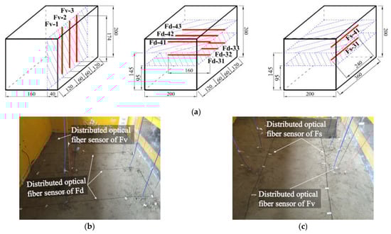 Layout of optical fiber sensors embedded in the conglomerate: (a) the spatial location of all the optical fiber sensors embedded in the physical model. Three types of embedding are proposed, which can be addressed as the vertically installed optical fiber sensors Fv1, Fv2, and Fv3; the horizontally installed optical fiber sensor Fd, with the embedding direction of dip (contains six measurement sections); and the horizontally installed optical fiber sensor Fs, with the embedding direction of strike (contains two measurement sections). (b,c) the installation process of the optical fiber sensor network.
