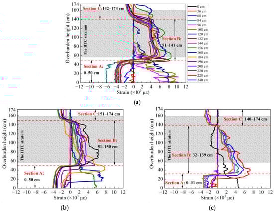 On the other hand, from the perspective of space development (i.e., increasing the height of overburden deformation), the strain distribution can be presented as follows: for a model height ranging from 0–50 cm (section A in Figure 4a), the strain curve develops as a negative stage form, which indicates that the measuring rock stratum is in a state of compressive stress, and it is the characterization of recompacting of rock mass in the caving zone. For a height ranging from 51–141 cm (section B in Figure 4a), the strain distribution presents as a wave-like corrugation, which can be divided into two wave peaks. The first wave peak has a strain of 7000 με and is located at a model height of 60 cm, while the second wave has a smaller strain of 5000 με. The corrugation shape of the strain distribution means that for a certain range of overburden stratum that is still situated in tensile stress, the rock mass could be moving downwards or overhanging above the mining gobs. When the height is over 141 cm (section C in Figure 4a), the strain distribution returned to negative and remained stable.