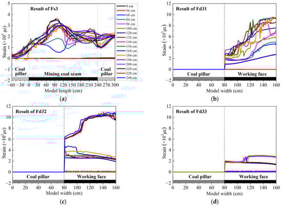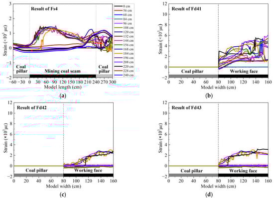 Figure 6b–d show the strain distributions of the optical fiber sensors Fd41, Fd42, and Fd43, respectively. The strain variation changes as the mining distance increases. The strain curve of Fd4 has a consistent increasing tendency with Fd3; the arched curve, without an obvious peak in the strain value and the sawtooth, is located at the model width of 90–110 cm. However, the maximum strain of the three measurement sections of the optical fiber sensor Fd4 is approximately 40,000 με, which is less than that of Fd3, indicating that the deformation and movement of the upper group of the HTC is much smaller than that of the lower group. This strain distribution comparison of Fd3 and Fd4 follows the same rule as that of Fs3 and Fs4, as mentioned above.