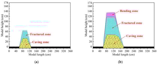 Figure 7a shows the vertical three-zone development of the overburden deformation when the mining distance is 68 cm; the broken area of the mining overburden presents a positive trapezoid shape, which includes a caving zone and fractured zone with an average height of 30 cm and 60 cm, respectively. The bending zone was not created because the failure height of the rock mass was just as high as that of the lower group of HTC, and the overlying hard and thick conglomerate would not easily bend or collapse. In fact, it is difficult to produce a bending zone in such a rock mass with the mechanical property of high rigidity; only a massive collapse or caving of rock mass below the HTC, gravity, and mining-induced stress would be sufficient to bend that stratum.
