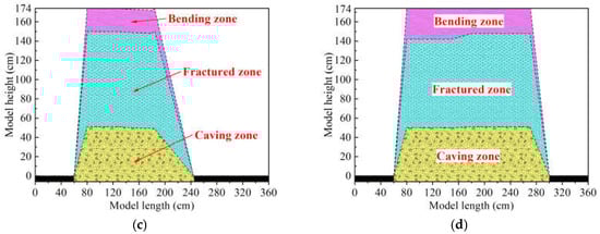 Development of the vertical three zones of overburden deformation: (a) shows that only two zones have been formed when the mining distance is 68 cm; the mining influence does not have enough impact on the higher rock stratum so that the bending zone cannot be created; (b) shows that the bending zone has emerged when the mining distance is 120 cm; (c) shows that the broken rock stratum has developed up to the full height of overburden when the mining distance is 184 cm; (d) shows the overall development of vertical three zones when the excavation is accomplished.