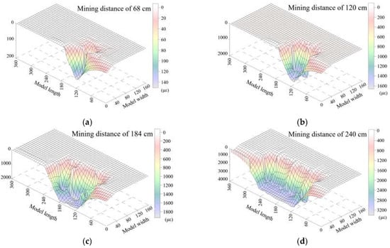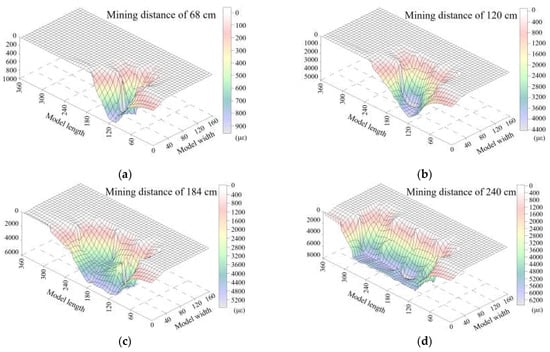 Figure 8 shows the deformation field of the lower group of HTC, which shows that the degree of deformation is small and only has a maximum strain of 900 με when the mining distance is 68 cm. This means that the lower group of conglomerates is in a state of slight deformation; the deformation will increase to a maximum strain of 40,000 με when the mining distance is 120 cm, which means that the lower group of the conglomerates has been fractured and starts to move downward. The deformation field creates a strain basin when the mining distance is 184 cm, and it is located in the model lengths ranging from 60–120 cm. This indicates that the 60–120 cm range of the lower conglomerate group has a large deformation and movement, and the basin will be completed after mining to 240 cm. This basin shape feature of the deformation field means that the rock stratum has been broken and collapses downward to the gob. If there is no deformation basin, it should only exhibit a slight movement (or micro fracture) and has no large deformation. Therefore, it can be concluded that the lower group of HTC will be broken in the whole stratum after the excavation of 184 cm.