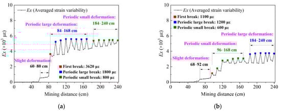 As shown in Figure 10a, the broken rule can be summarized into three stages: the first stage is when the mining distance is between 60 cm and 80 cm. In this stage, the lower group of HTC has begun to undergo a weak deformation; the deformation is relatively small and is maintained at a certain level with the excavation. The second stage is when the mining distance is between 84 and 168 cm; the Ex curve appears to have a sawtooth multi-peak shape, and the average sawtooth peak value is about 1800 με, which indicates that the lower group of HTC is in the stage of periodic large deformation. That is, the rock strata break periodically with the advance of the working face, resulting in the periodic weighting of the working face. The third stage is when the mining distance is between 184 and 240 cm; the Ex curve still shows the sawtooth shape, but the value of the average sawtooth peak decreases to 800 με, which indicates that the deformation state of the lower group of HTC tends to be eased. However, it still maintains the motion state of periodic small deformation.