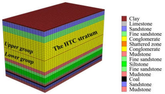 The research object of this study was the Qianqiu coal mine in Henan Province, China, where a HTC is located. The engineering geological analysis indicates that the average thickness of the coal seam and the overlying stratum in the Qianqiu coal mine are approximately 15 m and 806 m, respectively. The conglomerate appears from 210 m to 620 m above the coal seam, which is approximately 410 m thick, and was classified into two groups according to the engineering borehole investigation: an upper group and a lower group with thicknesses of 250 m and 160 m, respectively, separated by a weak intercalated layer with a thickness of 1 m. Preliminary field tests show that the conglomerate rock is a typical hard rock, with a maximum elasticity modulus of 32 × 103 MPa and a maximum compressive strength of 75 MPa.