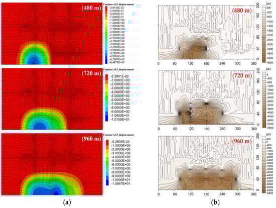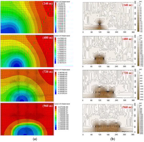 The numerical simulation procedure complied with the standard manual [61,62,63] and can be summarized as follows: a numerical model 1440 m in length, 800 m in width, and 886 m in height was built according to Table 3. The model had 286,498 network units and a total of 351,648 node units. The excavation face was 15 m in height, 400 m in width, and 960 m in advancement length, and 240 m boundary coal pillars were set on both sides of the model. The fifteen simulated rock strata were contacted to each other by attaching mesh, so that fourteen interfaces were set up between each stratum layer. Then, the mechanical parameters of each interface were determined according to the adjacent rock strata clamping the interface; the strength of the interface was usually set as ten times smaller than the adjacent rock strength, based on the manual of FLAC simulation. Elasto-plastic stress analysis was performed to calculate the stress and deformation at each mining distance. The material model was based on the Mohr-Coulomb failure criterion. Supporting clamps were applied to the bottom face and four surrounding faces of the model, meaning that those faces had no speed and displacement. The top face was set free. The large deformation mode was used in the FLAC calculation to match the movement of the rock stratum. The comparison results of the vertical displacement field where the optical fiber sensor was located in the lower group of the HTC and the strain distribution during the four excavation stages are shown in Figure 12 and Figure 13, respectively. The strain distribution indicates the vertical deformation of the rock stratum. Figure 12a shows the vertical displacement field of the rock stratum, and Figure 12b shows the corresponding deformation field obtained by DOFS monitoring.