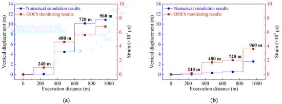 Vertical displacement distribution and comparison of the upper group of HTC strata: (a) the displacement field obtained by numerical simulation at the different mining excavation distances; (b) the deformation field calculated by DOFS monitoring results at the corresponding excavation distances.