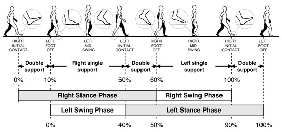 Generally, human walking is a periodic movement of body parts with repetitive motions. To better understand this periodic walking sequence, the gait phases can be used to describe a complete walking pattern and are graphically represented in Figure 3.