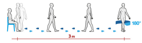 The Timed Up and Go (TUG) is a simple, quick, and widely used clinically approved test for the measurement of mobility and fall risk that was first introduced in 1991 by Podsiadlo and Richardson [10]. The authors described the instructions to be given to the subject of the test as follows: “rise from a standard arm chair, walk to a line on the floor 3 m away, turn, return, and sit down again.”, as graphically depicted in Figure 4. As in the 10 m Walk Test, a cone is usually placed at the point where the subject has to turn around.