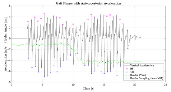 If instead the vertical acceleration is taken into account, as reported in Figure 7, each peak corresponds to a foot flat (FF); the previous minimum corresponds to the heel strike (HS) of the same foot; the following minimum corresponds to the toe off (TO) of the other foot. In this case, midstance (MM) can also be evaluated, and knowing the FF times, double support phases can be established as well. It is therefore clear that vertical acceleration data should be preferred. From mediolateral acceleration, it is possible to discriminate between left and right steps: the lower trunk accelerates shifts to the left during a right support phase and to the right during a left support phase. However, in the present analysis, discrimination between right and left steps was established using the gyroscope data, which appeared to be much more reliable. Figure 6 and Figure 7 also report the header, representing the rotation of the subject around his or her vertical axis.