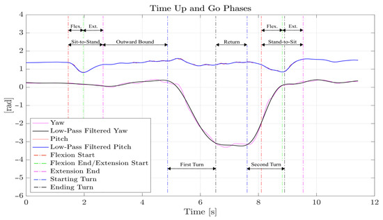 The duration of the entire test was measured with a stopwatch. To obtain the initial and final moments of SITS and SSTS phases, the pitch angle (the Euler angle corresponding to a rotation of the patient around his or her mediolateral axis) must be analyzed. Indeed, it can be noticed that the pitch angle varied significantly only in the rising and sitting phases, in which the sensor attached to the body followed the rotating motion described in the previous section. Similarly, turning phases can easily be found by observing the yaw angle (heading of the patient). Orientation data were filtered to obtain cleaner graphs to work on, in a tradeoff between the suppression of vibrational noise and the integrity of the information related to movement. A good compromise was found by low-pass filtering the pitch angle data with a cut-off frequency of and the yaw angle data with a cut-off frequency of .
